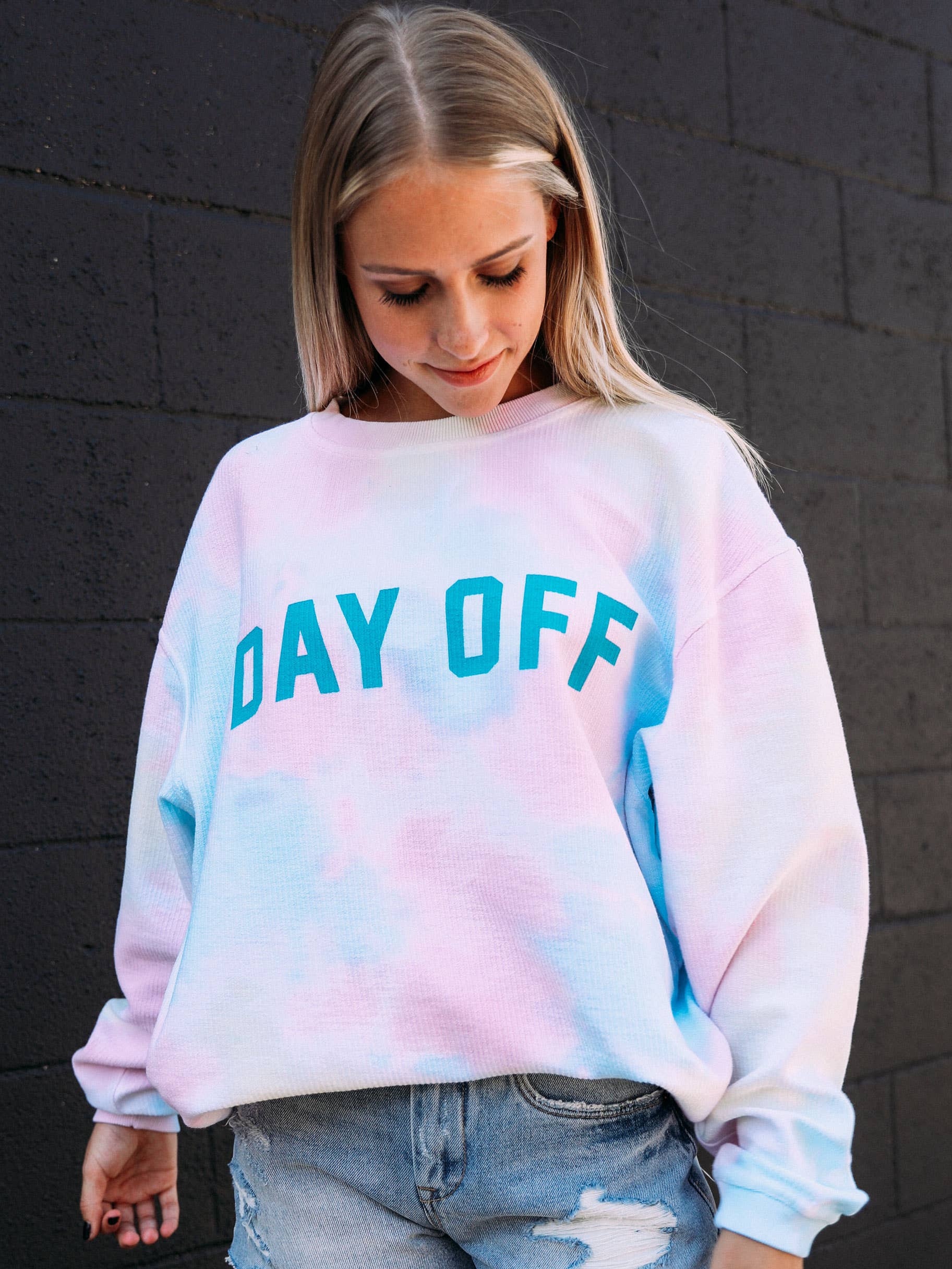 Whether you have the day off or not, grab this cozy oversized sweatshirt. It's great for lounging or for a casual day around town! Featuring an oversized fit, corded fabric, tie dye design, and white text. This pullover is perfect for styling with leggings and sneaks for the perfect chill outfit!