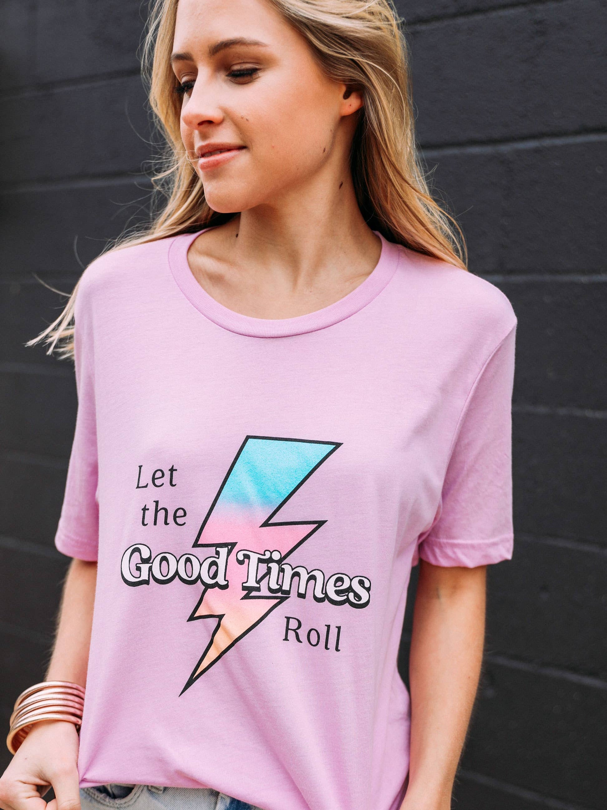 Let the good times roll! Featuring a light purple fabric, pastel lightning bolt graphic, and black + white text, this tee is perfect to take into spring! Whether you're binge watching Netflix on the couch, walking your dog around the neighborhood, or running errands around town, do it in style with this tee!