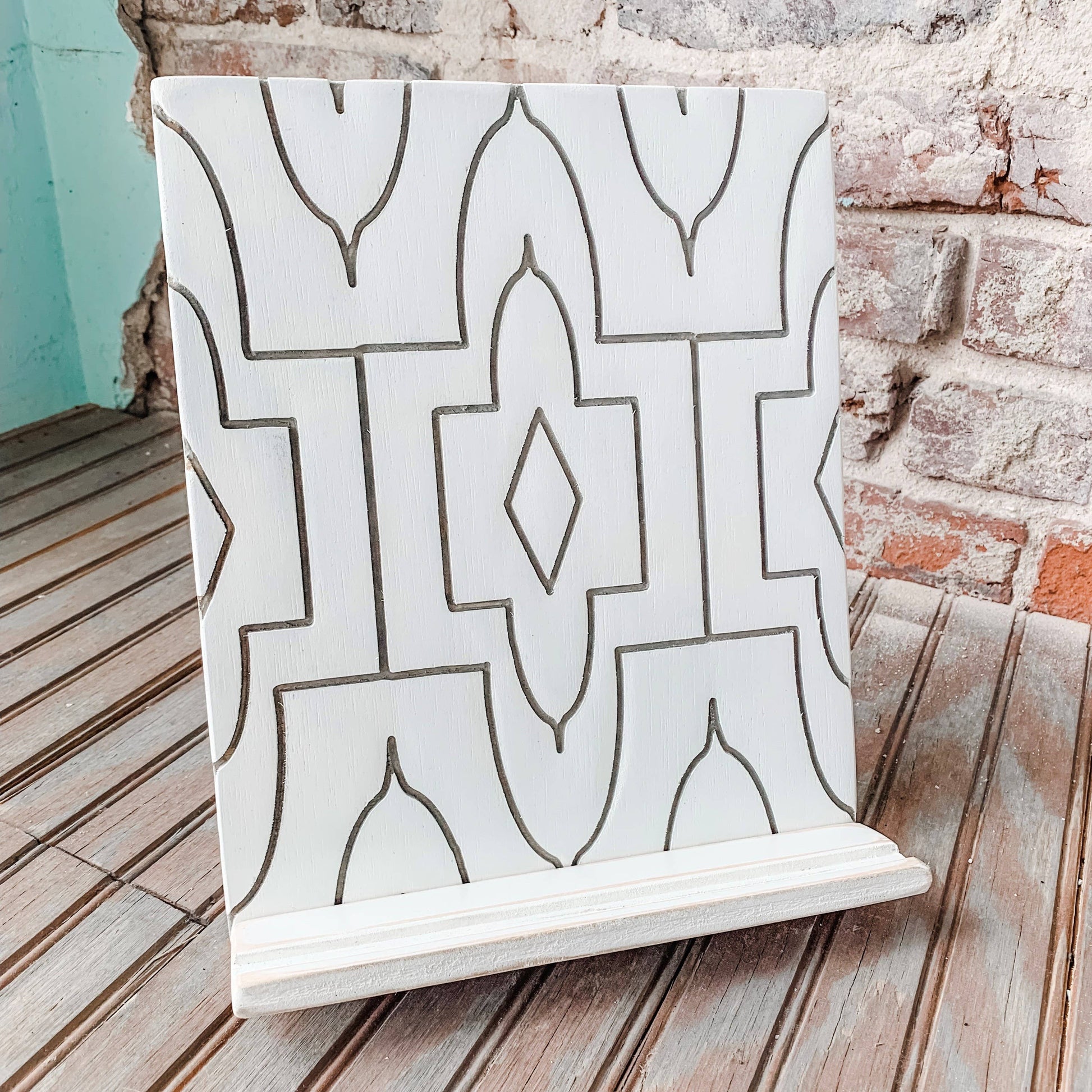 Keep your tablet screen propped up and perfectly in view, whether you’re cooking, reading or binge watching. This Moroccan inspired Tablet Stand is hand-cut and engraved with accents of naval, sea glass or poppy.