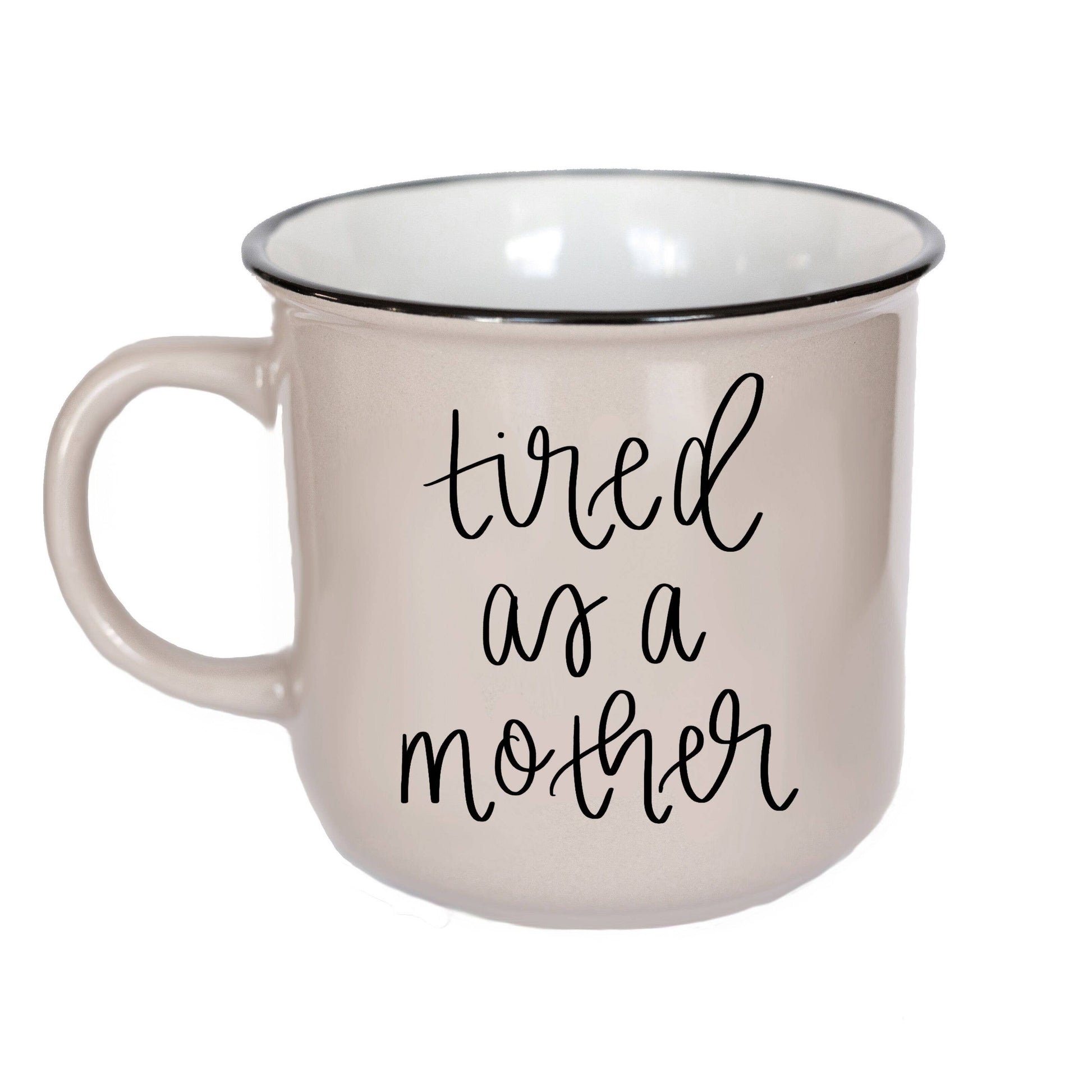 "Tired as a mother" light taupe brown colored mug with black detail.